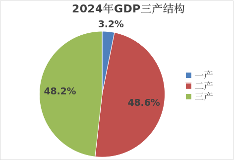 初步核算,2024年全市實現(xiàn)地區(qū)生產(chǎn)總值(GDP)1861.08 億元,按可比價格計算,比上年(下同)增長5.9%。其中,第一產(chǎn)業(yè)增加值58.88億元,增長3.7%;第二產(chǎn)業(yè)增加值905.22億元,增長7.5%;第三產(chǎn)業(yè)增加值896.98億元,增長4.4%。按戶籍人口計算,全市人均生產(chǎn)總值為174001元,增長6.3%,按2024年平均匯率1:7.122折算為24432美元。三次產(chǎn)業(yè)增加值結(jié)構(gòu)為3.2:48.6:48.2。