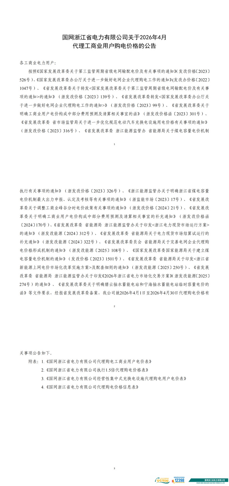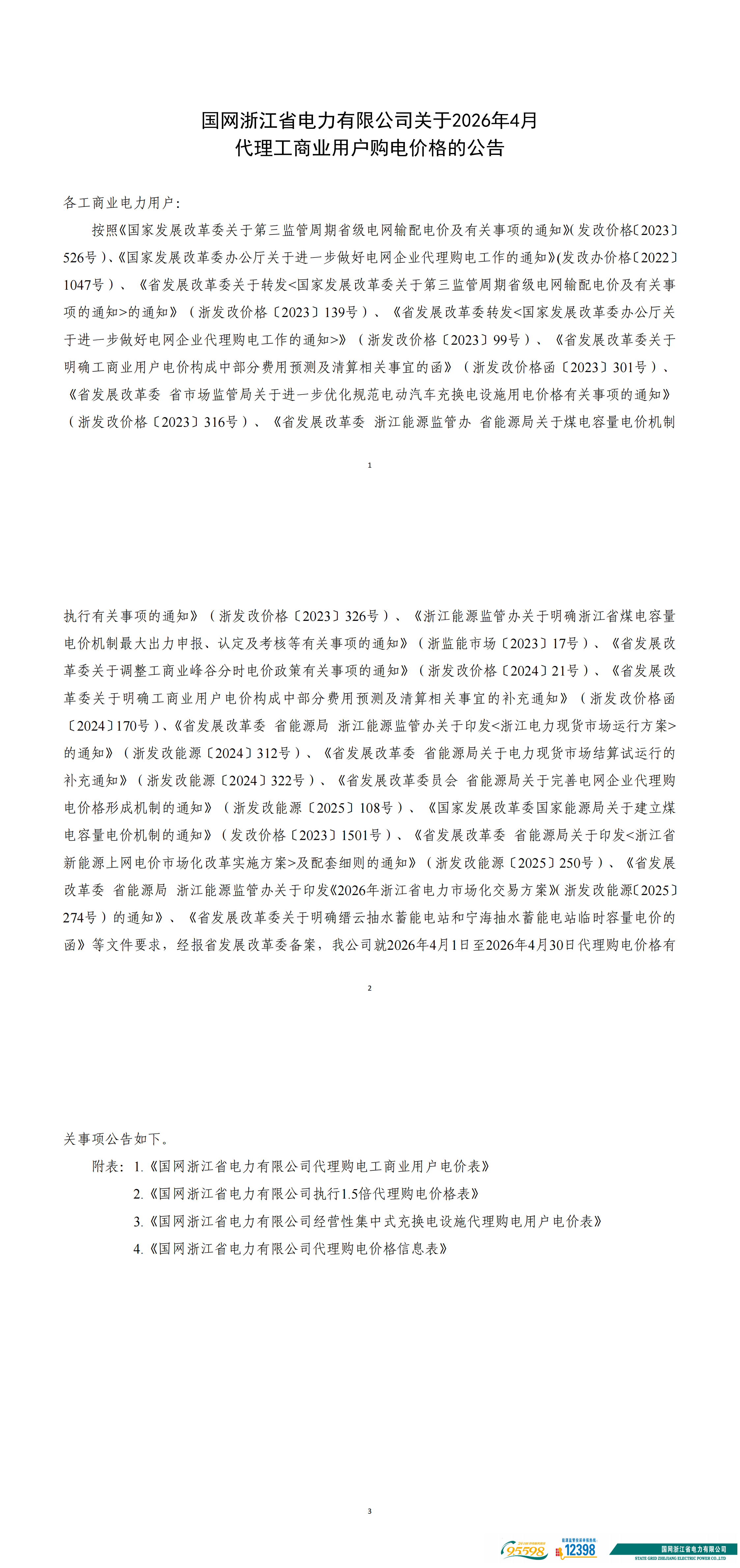 呈國網浙江省電力有限公司關于2026年4月代理工商業用戶購電價格的公告