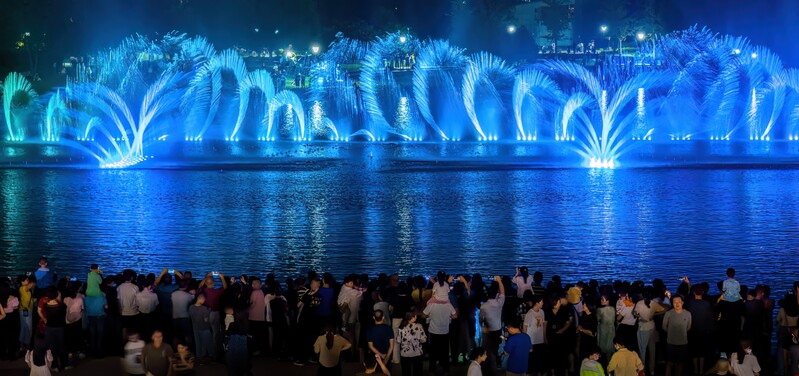 噴泉長80米,寬20米,平面布局采用圓弧相切的設(shè)計(jì),共計(jì)布置中流砥柱、群峰崢嶸、雷霆萬鈞、芙蓉出水、載歌載舞、霓裳羽衣、萬馬奔騰、千手觀音、 長虹貫日9種水型。主噴最高可達(dá)80米,副噴最高可達(dá)40米,應(yīng)用當(dāng)前領(lǐng)先的氣爆技術(shù)、數(shù)控?fù)u擺噴泉技術(shù)等多種高科技表現(xiàn)的綜合渲染演繹。