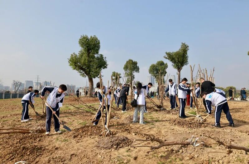 植樹現(xiàn)場,大家揮鍬鏟土、扶正樹苗、回填壓實(shí)、澆水潤苗,合力栽下香樟、紫薇等200余株樹苗。和煦的春光中,新苗迎風(fēng)挺立,生機(jī)勃勃。
